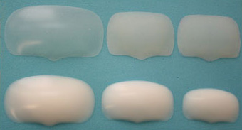 現今,本診所使用厚薄、大小、彎曲皆相異的6種矽膠植入物。