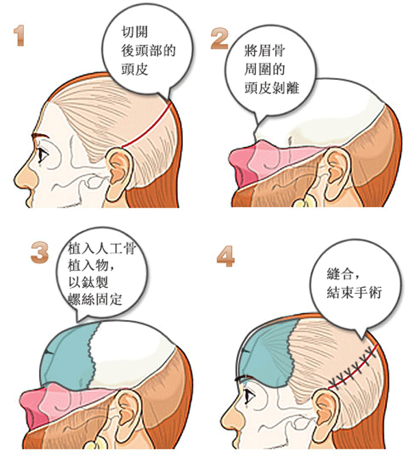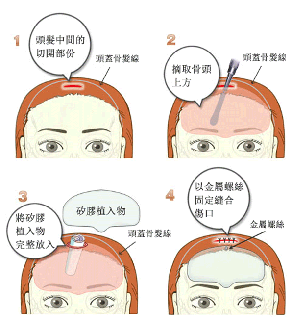 通常,在額髮生長處,或頭髮內約4~5cm進行切開手術,將額頭頭皮從頭骨剝離,再將植入物置入其中,在內擴展開來。